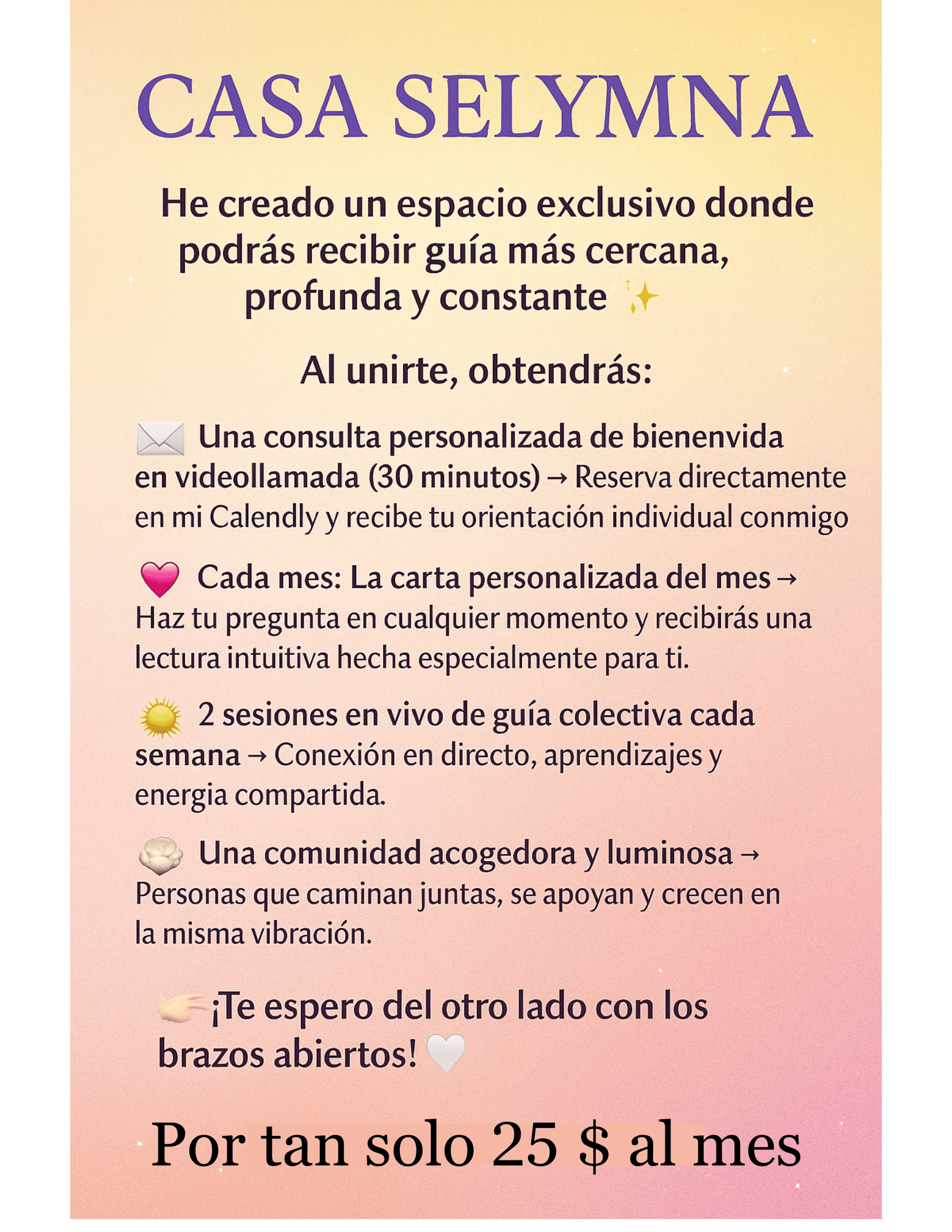 Quiero agradecerte profundamente por formar parte de Casa Selymna ✨, esta comunidad que creamos juntos para compartir luz, intuición y guía espiritual😌